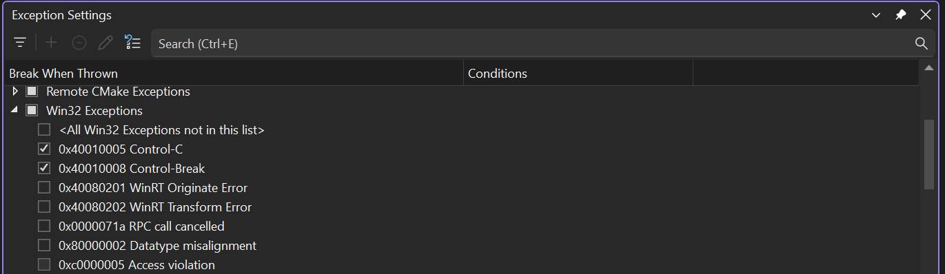 Enable ALL win32 Exceptions. Then try to launch the UE Editor, it will keep triggering a lot of exceptions itself. You can right click “Win32 Exceptions” and Reset To Default After.