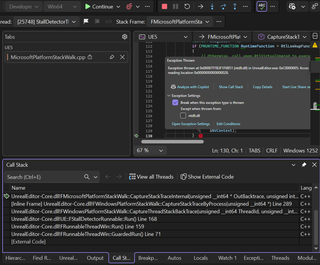 After detecting a stall, Unreal attempts to capture a stack trace for diagnostics.